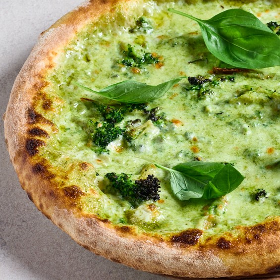 Spinach cream, grated parmesan, mozzarella, basil leaves, and broccoli