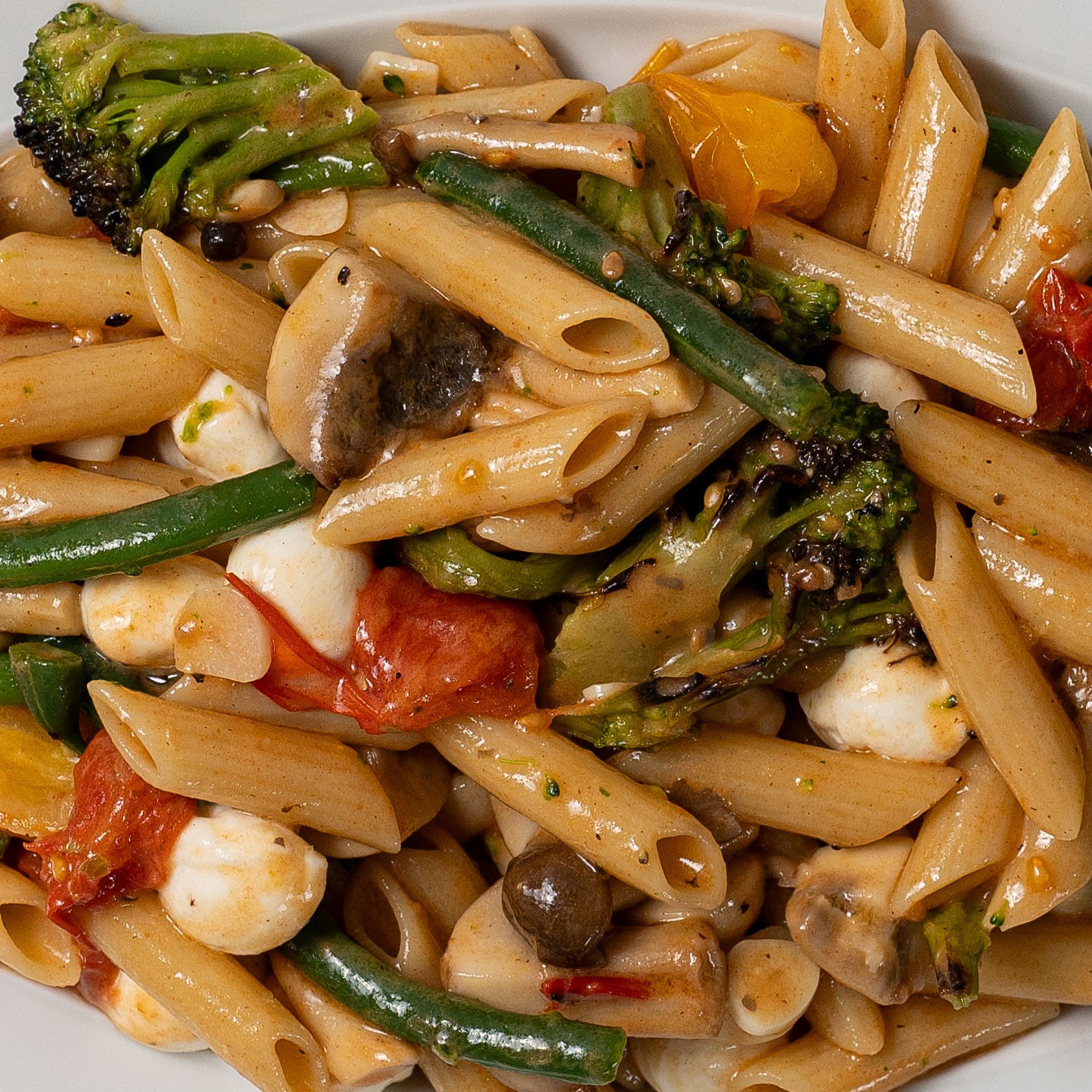 Stir-fried penne pasta with three types of mushrooms (shimaggi, portobello, champignon), broccoli, green beans, sliced garlic, cherry tomatoes, and baby mozzarella.